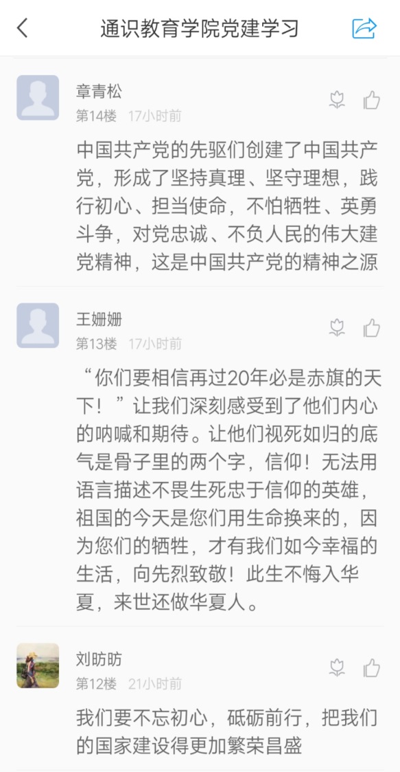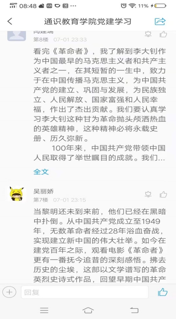 歷史川流不息,精神代代相傳。在觀影結(jié)束后各黨員通過(guò)“學(xué)習(xí)通”-“通識(shí)教育學(xué)院黨總支”-“討論”-“觀看黨建電影《革命者》,撰寫(xiě)心得體會(huì)”,通過(guò)觀看紅色電影《革命者》,師生黨員深刻感受到中國(guó)共產(chǎn)黨先驅(qū)們偉大的建黨精神,在奮斗中堅(jiān)持真理、堅(jiān)守理想,踐行初心、擔(dān)當(dāng)使命,不怕?tīng)奚?、英勇斗?zhēng),對(duì)黨忠誠(chéng)、不負(fù)人民,大家紛紛表示要繼續(xù)弘揚(yáng)光榮傳統(tǒng)、賡續(xù)紅色血脈,永遠(yuǎn)把偉大建黨精神繼承下去、發(fā)揚(yáng)光大。