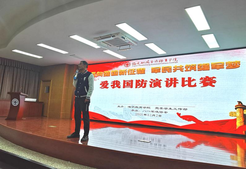 12月2日晚,由通識教育學院和黨委學生工作部主辦,八一軍魂社協(xié)辦的2021年“愛我國防”主題演講比賽在1號樓學術(shù)報告廳舉行。黨委學生工作部部長王心金、紀委辦公室副主任林栩、學生處資助科科長張瑞青、各系部團總支負責人、軍事理論教研室老師、通識教育學院部分老師和300多個學生共同觀看了比賽。