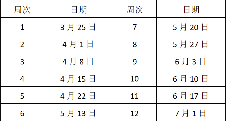 每班共上課12周,每周1次課,每次課90分鐘,共計(jì)12次課24學(xué)時(shí)。上課時(shí)間詳見教學(xué)計(jì)劃(如遇特殊情況,課程將會(huì)適當(dāng)調(diào)整)。