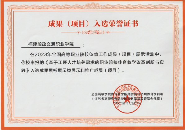 活動(dòng)選拔出黨的十八大以來(lái)全國(guó)高等職業(yè)院校學(xué)校體育工作獲得的省部級(jí)及以上“三教”改革成果和建設(shè)項(xiàng)目,經(jīng)過(guò)專(zhuān)家評(píng)選出30所優(yōu)秀教學(xué)成果交流,我校《基于工匠人才培養(yǎng)需求的職業(yè)院校體育教學(xué)改革創(chuàng)新與實(shí)踐》的教學(xué)成果入選本次成果征集活動(dòng)。