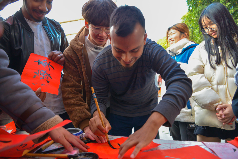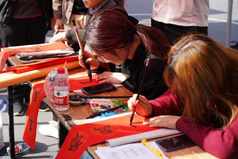 現(xiàn)場院團委書法社團和各系宣傳部的同學們揮毫潑墨,灑下新年祝福的話語, 活動現(xiàn)場還吸引了我院外國留學生一同為新年寫下祝福。一幅幅寓意祥瑞的春聯(lián),一個個飽含神韻的“福”字送到了教職工和同學們的手中,活動現(xiàn)場已然是一片喜慶的紅色海洋。師生一邊欣賞書法技藝,一邊品評春聯(lián)寓意,都爭先迎“?!被丶遥矏傊橐缬谘员?。整個活動現(xiàn)場翰墨的清香與眾人的歡笑,讓濃濃的年味提前灑滿交院。