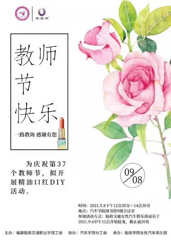 為慶祝第37個教師節(jié),福建船政交通職業(yè)學(xué)院工會主辦,汽車學(xué)院分工會協(xié)辦,船政學(xué)院女性汽車俱樂部承辦擬于9月8日下午12點(diǎn)30分工會在汽車學(xué)院(圖書館9樓)開展精油口紅DIY活動。名額僅限20名,歡迎大家踴躍報(bào)名。
