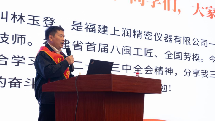 啟動(dòng)儀式后,全國勞動(dòng)模范、全國技術(shù)能手、享受國務(wù)院政府特殊津貼專家福建上潤精密儀器有限公司林玉登分享他30年工作的艱辛歷程和生動(dòng)事跡。他三十年如一日認(rèn)真做好精密制造這一件事,“簡單的事情重復(fù)做,重復(fù)的事情堅(jiān)持做”,他用堅(jiān)持不懈、永不放棄的精神為推動(dòng)福建傳統(tǒng)產(chǎn)業(yè)轉(zhuǎn)型升級(jí)和智能制造做出了積極貢獻(xiàn)。在場(chǎng)的觀眾都從林玉登勞模事跡中深刻感悟勞模精神、勞動(dòng)精神、工匠精神的實(shí)質(zhì)內(nèi)涵。