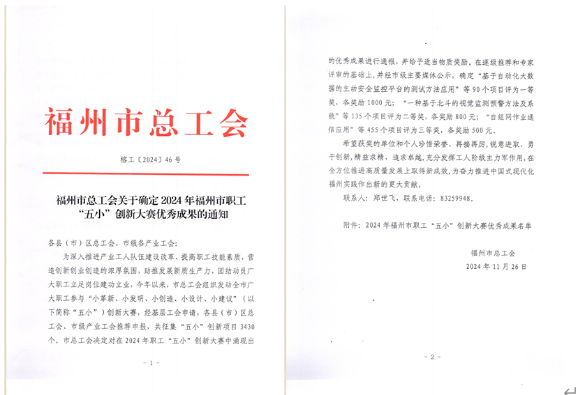 近日,福州市總工會公布《關(guān)于確定2024年福州市職工 “五小”創(chuàng)新大賽優(yōu)秀成果的通知》,我院鄒澤昌勞模和工匠人才創(chuàng)新工作室報(bào)送的創(chuàng)新成果榮獲一等獎2項(xiàng)、二等獎1項(xiàng)、三等獎2項(xiàng)。