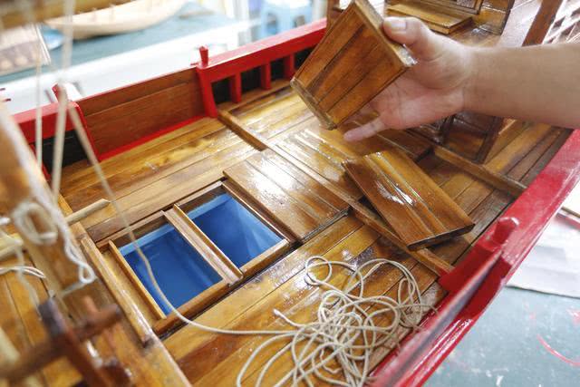 “這是大船縮小到十分之一的樣子,看著小,卻堪比現(xiàn)代的房車,廚房、客廳、臥室、廁所一應俱全!”江金春掀開甲板,露出10個隔艙,每個都是獨立、互不透水的。他說,這是福船的“水密隔艙”建造技藝,已列入聯(lián)合國教科文組織急需保護的非物質文化遺產名錄。