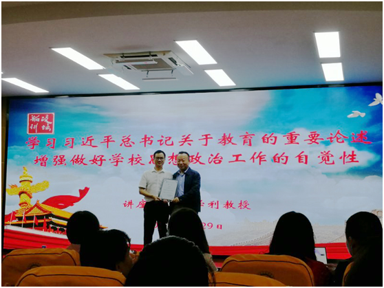 講座中,王教授從習(xí)近平總書記關(guān)于教育的重要論述的核心要義出發(fā),分析了習(xí)近平總書記重要論述的理論支柱,提出了做好思想政治工作要解決根本性的認識問題。他指出,要從習(xí)近平總書記近兩年關(guān)于思想政治工作的論述中,把握高校思想政治工作的趨勢,提高做好工作的自覺性。他從明確思想政治工作的意義、堅持社會主義辦學(xué)原則、提升學(xué)生的思想政治素質(zhì)、發(fā)揮教師關(guān)鍵作用、改革創(chuàng)新構(gòu)建思政工作體系、加強黨的領(lǐng)導(dǎo)幾方面闡述了如何做好思想政治工作,分析透徹、舉例生動、深入淺出,吸引了在場聽眾頻頻點頭認可。陳宜大副書記為王學(xué)利教授頒發(fā)了特聘教授聘書,希望能保持長期聯(lián)系,加強交流。