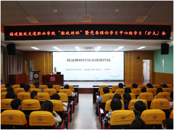 中國教育在線訊 10月15日,學院舉辦“船政講壇”暨黨委理論學習中心組學習(擴大)會,特邀福建自貿試驗區(qū)研究院執(zhí)行院長、省委黨校法學教研部副教授王利平作題為《民法典時代和治理現代化》專題輔導講座,黨委理論學習中心組成員、副科級以上干部、各黨總支、輔導員、馬克思主義學院全體教師,部分學生等200余人參加。