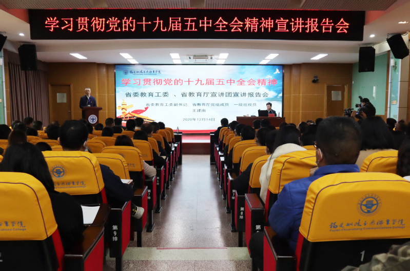 12月14日上午,省委教育工委、省教育廳學(xué)習(xí)貫徹黨的十九屆五中全會精神宣講報告會在我院北校區(qū)一號樓六樓學(xué)術(shù)報告廳舉行。省委教育工委、省教育廳“百人宣講團(tuán)”成員、省委教育工委副書記,省教育廳黨組成員、一級巡視員王建南作宣講報告。學(xué)院在家領(lǐng)導(dǎo)、副科級以上干部、兩級理論學(xué)習(xí)中心組成員、全院正高級教師、馬克思主義學(xué)院教師、全體輔導(dǎo)員、各黨總支委員及支部委員、各民主黨派支部委員、習(xí)近平新時代中國特色社會主義思想讀書社、船政青年求是社成員等近360余名師生聆聽了宣講報告。學(xué)院黨委書記張海明主持報告會。