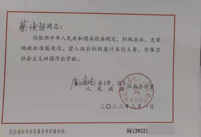 2022年1月,即將大學畢業(yè)的他毅然決定再次報名應(yīng)征,決定畢業(yè)季二次入伍,再續(xù)軍旅情緣,用自己的實際行動續(xù)寫保家衛(wèi)國的榮光。