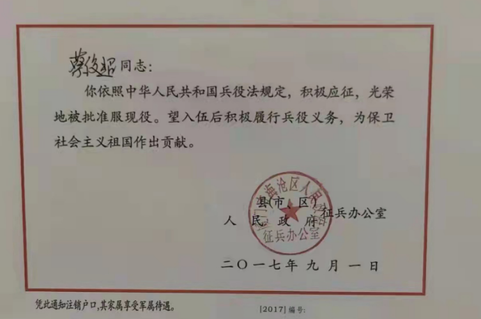 戎涯無悔,熱血青年志在軍營,祝福蔡俊超同學一切順利,實現(xiàn)“二次入伍“夢,在火熱的軍營創(chuàng)造精彩人生!