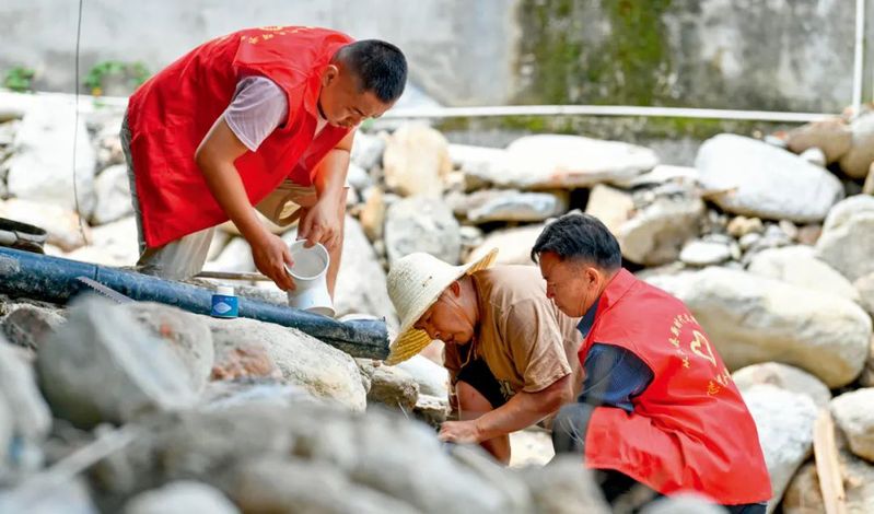 在貴州省從江縣剛邊壯族鄉(xiāng)銀平村,黨員志愿者幫助受災(zāi)村民修整水管(2022年7月1日攝) 楊文斌攝