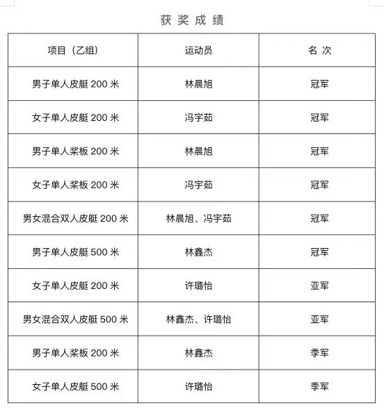 學(xué)院水上運動隊首度亮相中國大學(xué)生皮劃艇錦標賽,參加高職高專組(乙組)比賽,隊員們奮力拼搏,展現(xiàn)出了良好的競技狀態(tài),最終獲得6金2銀2銅的佳績。我校代表隊代還獲得體育道德風(fēng)尚獎、林杰獲得優(yōu)秀教練員稱號、林晨旭獲得優(yōu)秀運動員稱號。