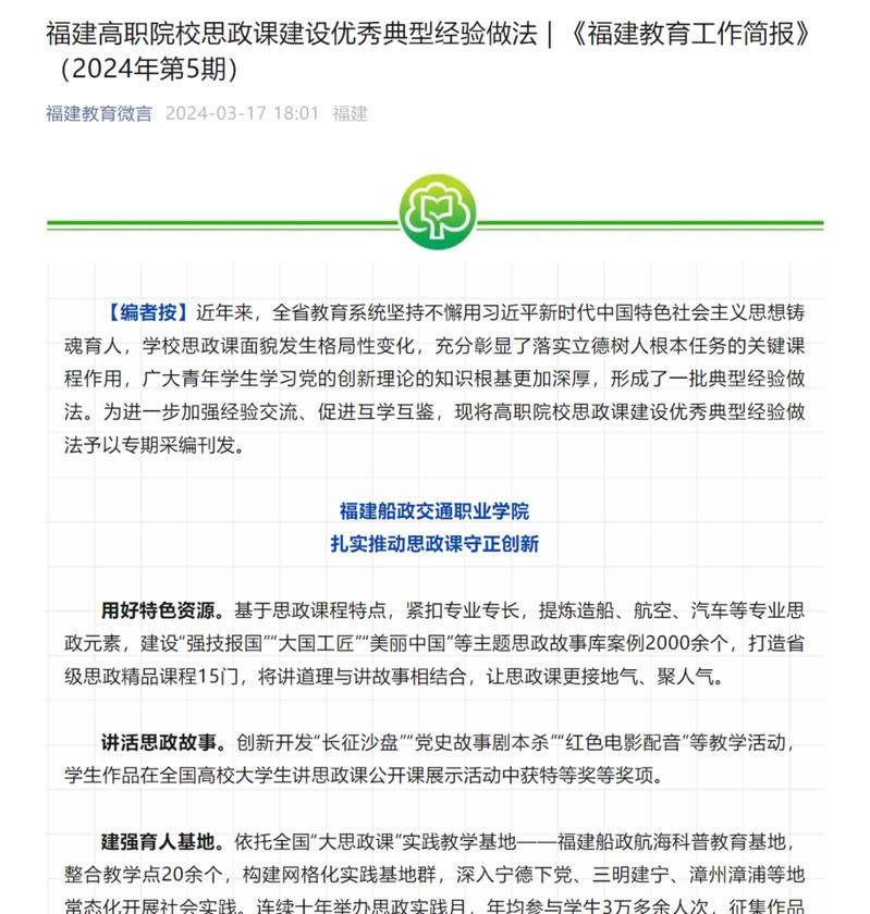 【編者按】近年來(lái),全省教育系統(tǒng)堅(jiān)持不懈用習(xí)近平新時(shí)代中國(guó)特色社會(huì)主義思想鑄魂育人,學(xué)校思政課面貌發(fā)生格局性變化,充分彰顯了落實(shí)立德樹人根本任務(wù)的關(guān)鍵課程作用,廣大青年學(xué)生學(xué)習(xí)黨的創(chuàng)新理論的知識(shí)根基更加深厚,形成了一批典型經(jīng)驗(yàn)做法。為進(jìn)一步加強(qiáng)經(jīng)驗(yàn)交流、促進(jìn)互學(xué)互鑒,現(xiàn)將高職院校思政課建設(shè)優(yōu)秀典型經(jīng)驗(yàn)做法予以專期采編刊發(fā)。