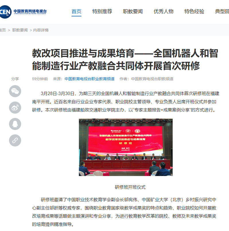 3月28日-3月30日,為期三天的全國機器人和智能制造行業(yè)產(chǎn)教融合共同體首次研修班在福建南平開班。近百名來自行業(yè)企業(yè)專家代表、職業(yè)院校主管領導、專業(yè)負責人出席開班儀式并參加研修。本次研修班由福建船政交通職業(yè)學院主辦,以“專家主題報告+成果案例分享”的方式進行。
