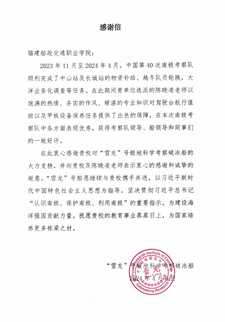 陳曉凌老師在船擔(dān)任駕駛員職務(wù),他以飽滿的熱情、務(wù)實(shí)的作風(fēng)、精湛的專業(yè)知識(shí)對(duì)駕駛臺(tái)航行值班以及甲板設(shè)備保養(yǎng)任務(wù)提供了出色的保障,在本次南極考察隊(duì)中各方面表現(xiàn)優(yōu)秀,獲得考察隊(duì)領(lǐng)導(dǎo)、船領(lǐng)導(dǎo)和同事們的一致好評(píng)。
