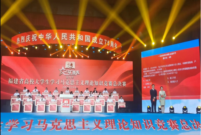 為熱烈慶祝中華人民共和國成立75周年,堅持不懈用習(xí)近平新時代中國特色社會主義思想鑄魂育人,引導(dǎo)青年學(xué)生立報國強(qiáng)國大志向、做挺膺擔(dān)當(dāng)奮斗者,9月27日,由中共福建省委教育工委主辦,福建省高校思想政治理論課教學(xué)指導(dǎo)委員會、福建教育電視臺承辦的第九季福建省高校大學(xué)生學(xué)習(xí)馬克思主義理論“一‘馬’當(dāng)先”知識競賽總決賽在福州大學(xué)旗山校區(qū)落下帷幕。我院黨委書記陳宜大攜師生代表參與活動觀摩。