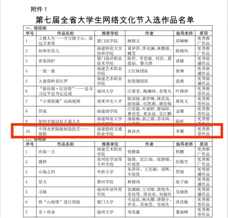 日前,中共福建省委教育工委、中共福建省委網(wǎng)信辦公布第七屆全省大學生網(wǎng)絡文化節(jié)和全省高校網(wǎng)絡教育優(yōu)秀作品推選展示活動獲獎結果。由我院航海學院林沛杰同學創(chuàng)作的微視頻《中國水密隔艙制造技藝——福船》獲微視頻類別“優(yōu)秀推薦作品”獎項。