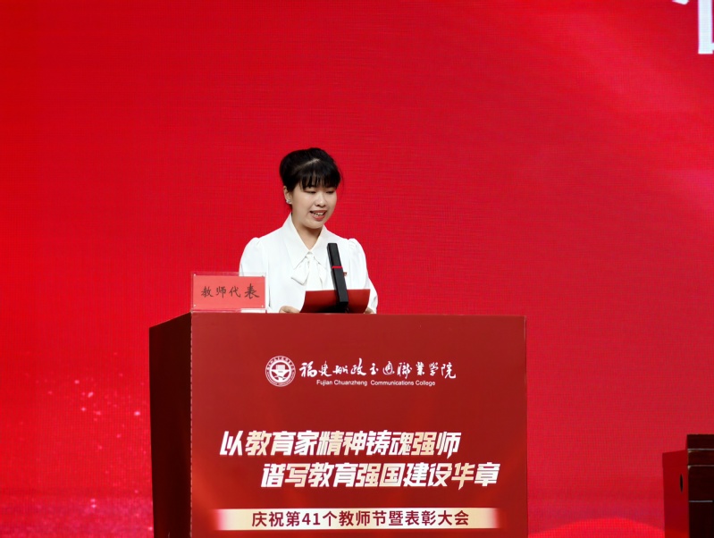 9月10日下午,我院舉行慶祝第41個(gè)教師節(jié)暨表彰大會(huì)。黨委書記陳宜大,黨委副書記、院長陳群,黨委副書記張輝,紀(jì)委書記謝建山,副院長陳常暉出席會(huì)議。會(huì)議由陳常暉主持。全體教職工、榮退人員代表、福建閩清職業(yè)中專學(xué)校代表、校友代表、學(xué)生代表歡聚一堂,共同參加此次會(huì)議。本次慶祝表彰大會(huì)采用線下會(huì)場和線上直播同步進(jìn)行。