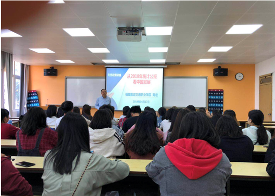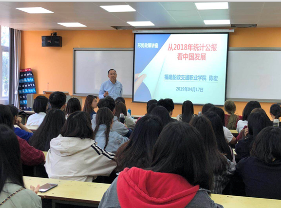 為貫徹落實《中共福建省委教育工委關于進一步規(guī)范高校形勢與政策課教育教學工作的通知》(閩委教思〔2017〕13 號)指出,“高校黨委書記、校長和院(系)黨組織書記、院長(系主任)每學期至少為學生作一次形勢政策報告”。根據(jù)《教社科廳函〔2019〕9號教育部辦公廳關于印發(fā)<高校“形勢與政策”課教學要點(2019年上輯)>的通知》,交通經(jīng)濟系主任于2019年4月17日15:50在31#307教室為交通經(jīng)濟系會計專業(yè)學生做了一場題為“從2018年統(tǒng)計公報看中國發(fā)展”的主題報告。報告上陳宏主任從十九大報告不忘初心,牢記使命,高舉中國特色社會主義偉大旗幟,決勝全面建成小康社會,奪取新時代中國特色社會主義偉大勝利,為實現(xiàn)中華民族偉大復興的中國夢不懈奮斗。中國共產黨人的初心和使命,就是為中國人民謀幸福,為中華民族謀復興。