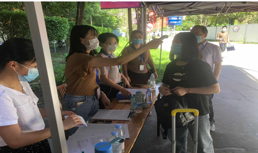 炎炎夏日,交通經(jīng)濟(jì)系全體輔導(dǎo)員老師們與共建支部的老師們輪流參與志愿工作,工作從校門口就開始了。他們一絲不茍地一步步引導(dǎo)每一位返校同學(xué)完成手部消毒、口罩更換、體溫檢測、健康碼核驗等工作,這一切只為每一位同學(xué)的平安。