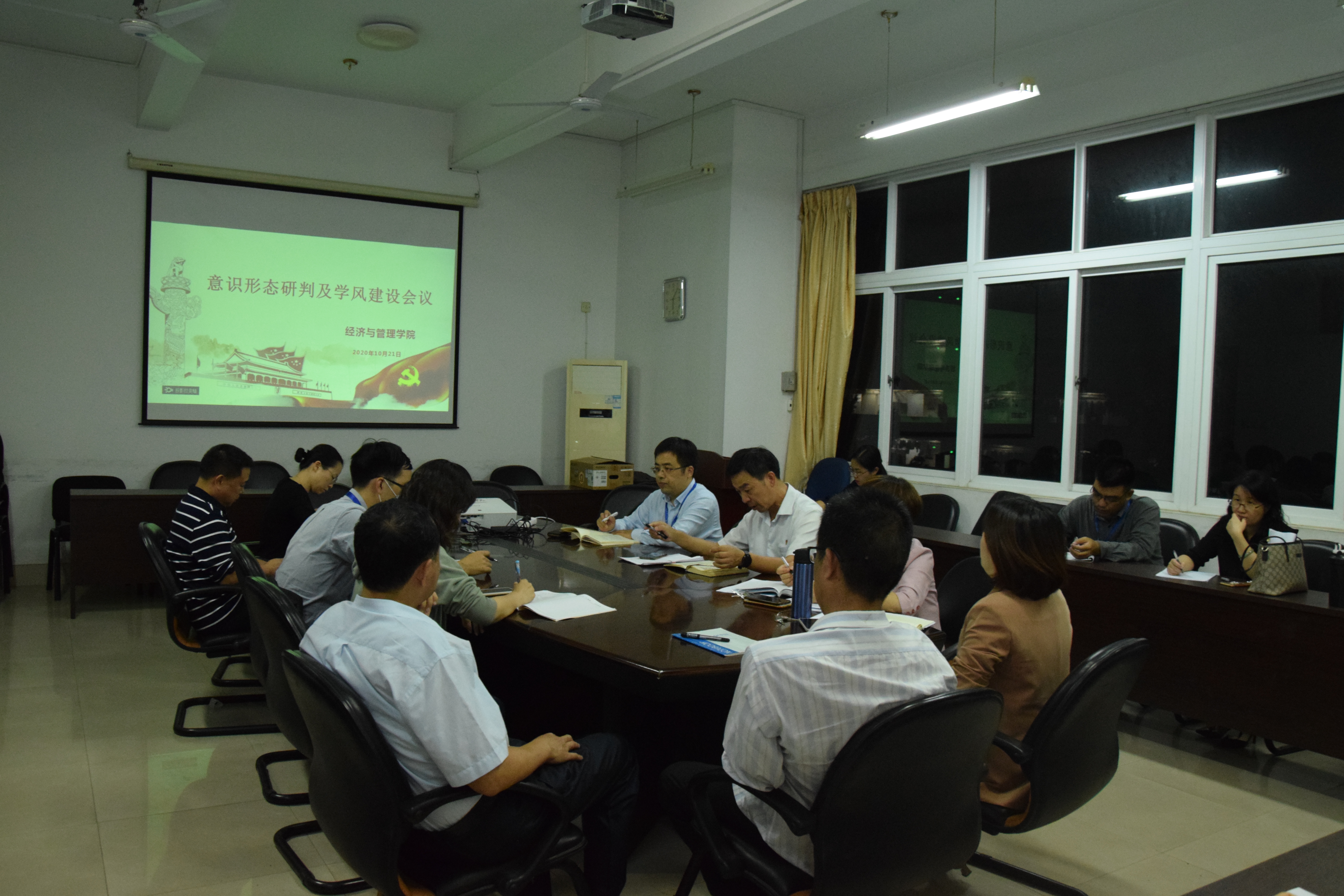 為進(jìn)一步引領(lǐng)全體教師厚植意識(shí)形態(tài)正向理念,筑牢思想政治根基,推動(dòng)理想信念教育常態(tài)化、制度化。2020年10月21日,經(jīng)濟(jì)與管理學(xué)院在經(jīng)管樓412會(huì)議室召開新學(xué)期意識(shí)形態(tài)工作研判及學(xué)風(fēng)建設(shè)會(huì)議。經(jīng)管院領(lǐng)導(dǎo)、團(tuán)總支書記、教研室主任、綜辦主任、實(shí)訓(xùn)中心主任、全體輔導(dǎo)員、各支部書記、副書記等出席會(huì)議。會(huì)議由院黨總支副書記林麗萍主持。