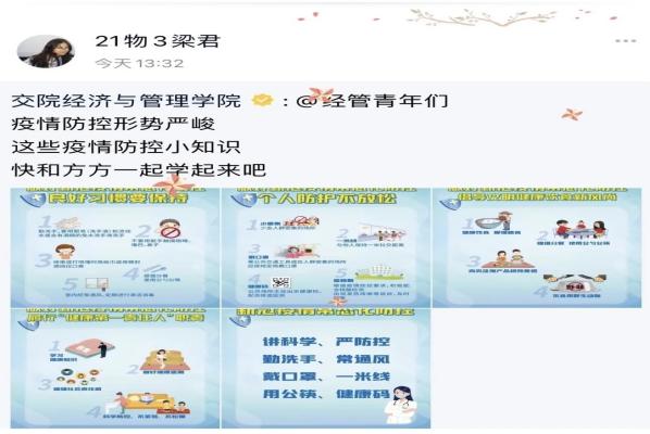 線上、線下進行防疫宣傳。突擊隊隊員們深入學生宿舍,與寢同學們親切地交談,叮囑他們在校內要做好疫情防護工作,并積極配合學校和學院的防疫工作,為疫情防控工作貢獻自己的一份力量。同時隊員們還利用QQ、微信等平臺傳播疫情防護小知識引導同學們科學理性看待疫情。