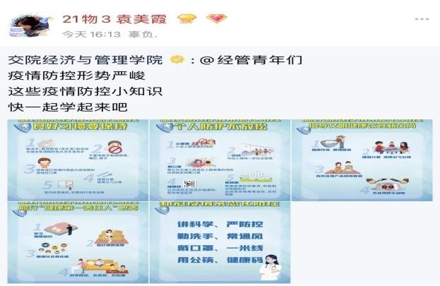 為了抵制疫情來襲,經(jīng)濟與管理學院青年突擊隊用自己的方式逆風迎戰(zhàn)。4月本應春光明媚充滿希望,但一場突如其來的疫情,打亂了我們的計劃。我們興致勃勃討論過的春日之約,變成眾志成城全力抗疫。這場戰(zhàn)疫里,有一群青年志愿者的身影,格外打動人心。為打贏疫情防控阻擊戰(zhàn)無私奉獻,因為我們堅信,疫情終會過去,勝利就在眼前。讓我們用自己的方式,凝聚戰(zhàn)“疫”力量。