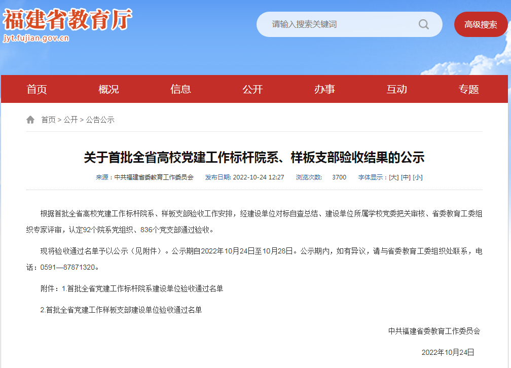 近日,中共福建省委教育工作委員會公布首批全省高校黨建工作標桿院系、樣板支部驗收評估情況,我院第三黨支部順利通過“福建省高校黨建工作樣板支部”驗收。