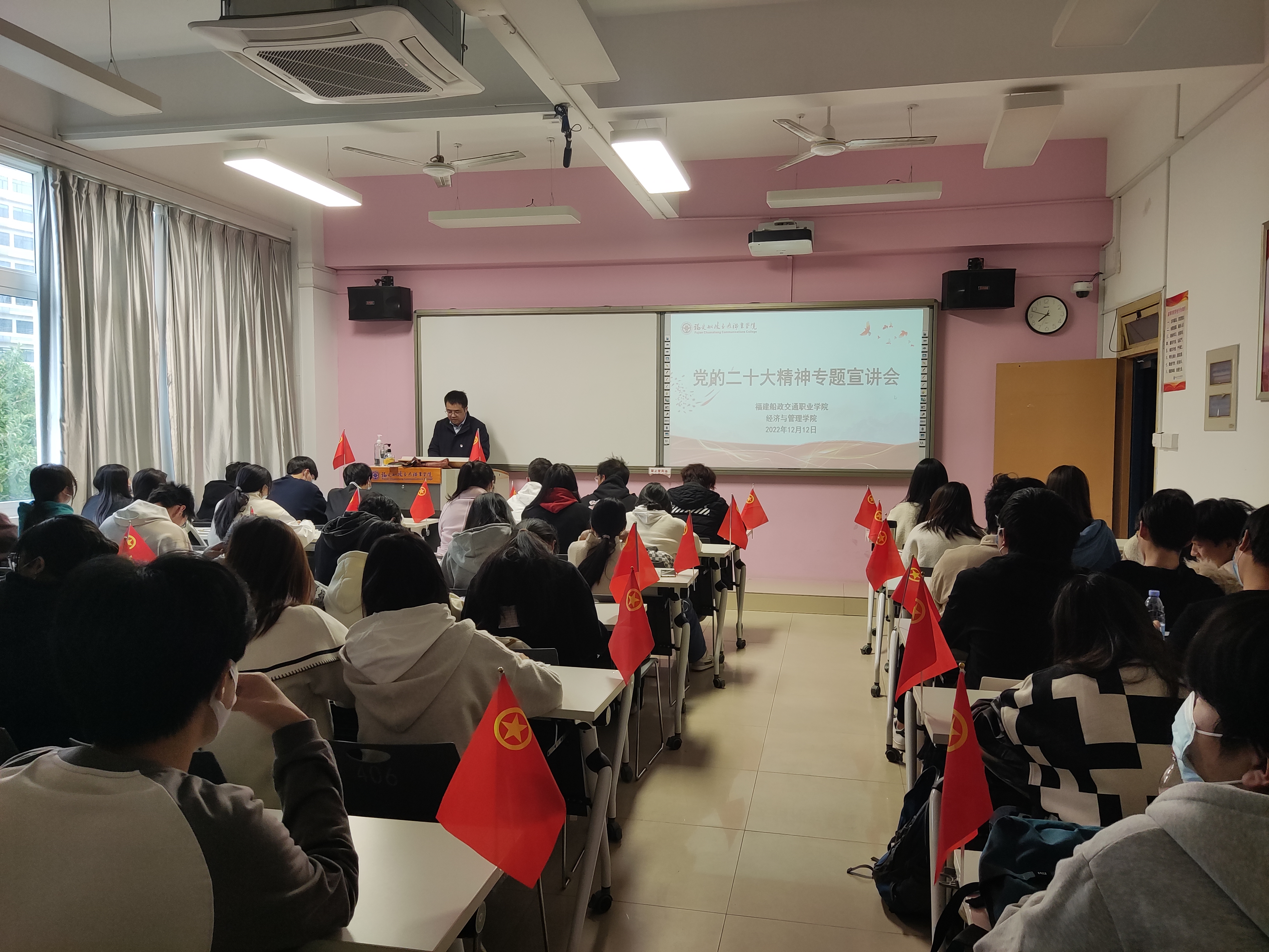 為深入學習宣傳貫徹黨的二十大精神,2022年12月12日下午,經(jīng)濟與管理學院院長房曰榮于福船園求實樓409教室開展形勢與政策講座之黨的二十大精神專題宣講會。經(jīng)濟與管理學院2022級電子商務1班全體同學參加了此次宣講會。