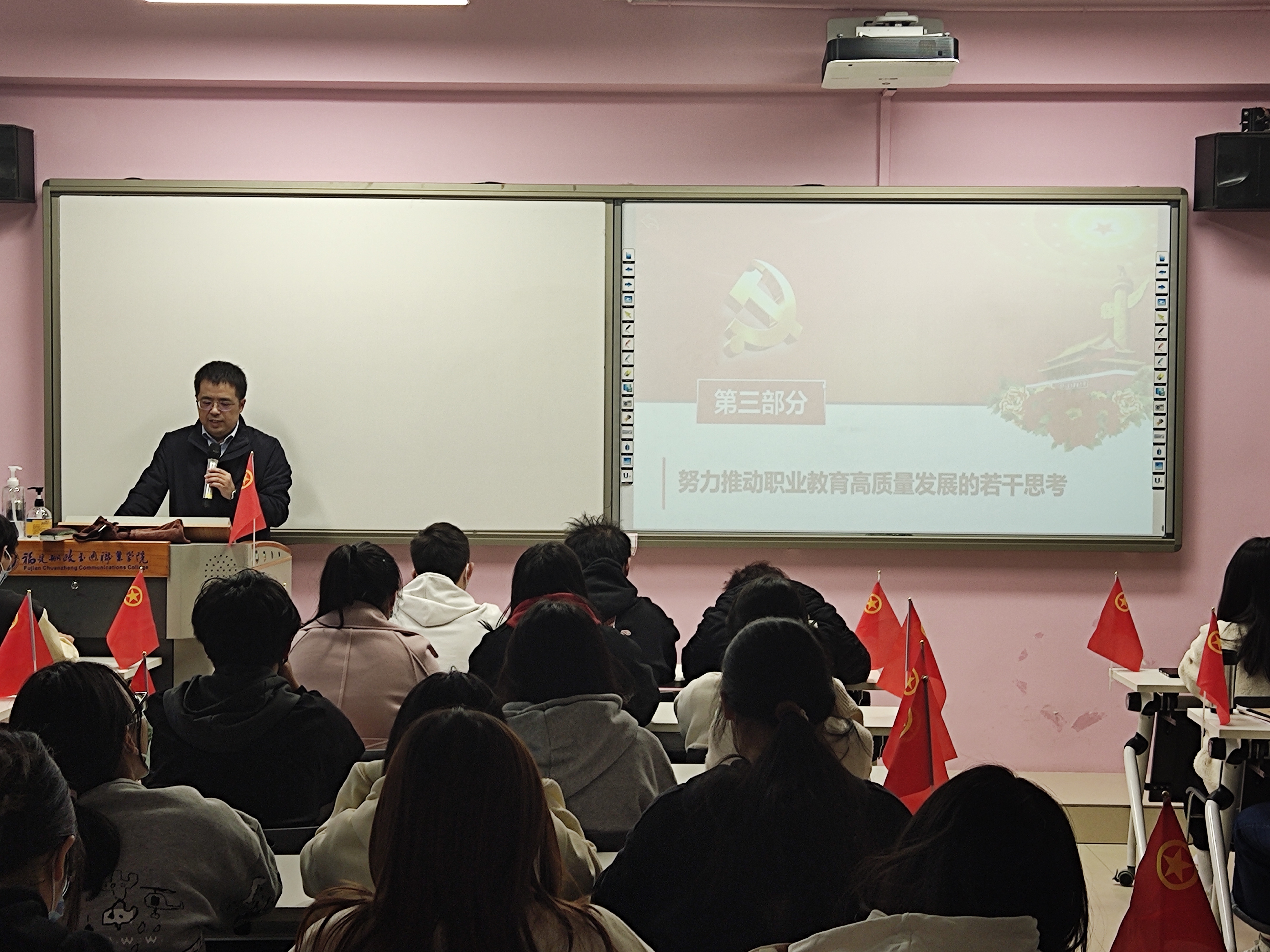 會上,房院長以《深入學習貫徹黨的二十大精神,努力推動職業(yè)教育高質(zhì)量發(fā)展》為題,圍繞“黨的二十大主題”“過去5年的工作和新時代10年的偉大變革”“努力推動職業(yè)教育高質(zhì)量發(fā)展的若干思考”三個方面,結(jié)合自身工作及學習體會,對黨的二十大精神作了全面系統(tǒng)的闡釋解讀。