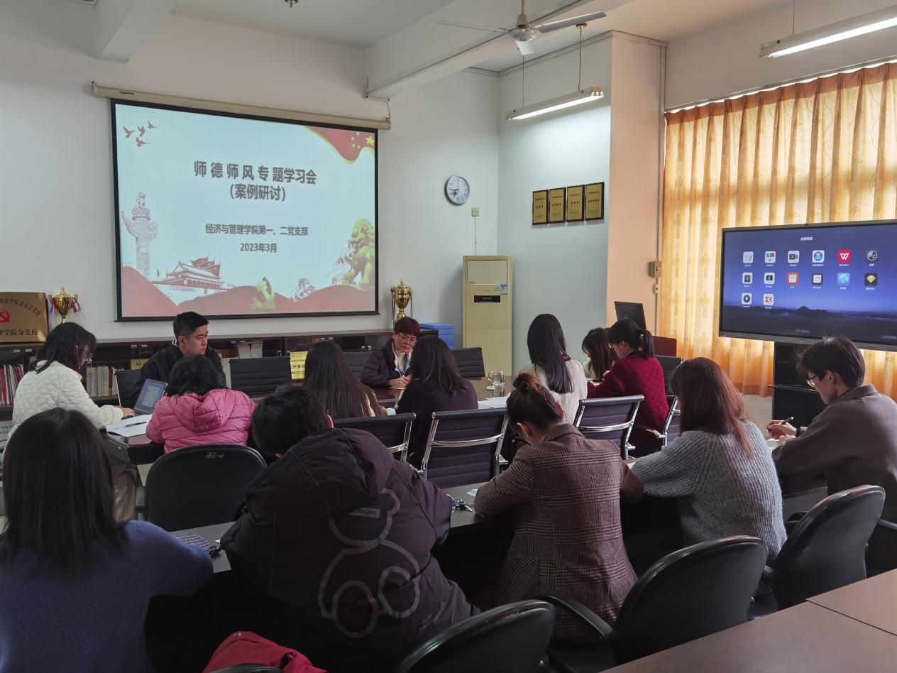 為全面貫徹落實(shí)黨的二十大報(bào)告中提出的“加強(qiáng)師德師風(fēng)建設(shè),培養(yǎng)高素質(zhì)教師隊(duì)伍,弘揚(yáng)尊師重教社會風(fēng)尚”精神,切實(shí)落實(shí)新時(shí)代高校教師“鑄魂育人”使命,增強(qiáng)教師愛崗敬業(yè)、為人師表、以德立教、以德立身的自覺性。2023年3月31日,經(jīng)濟(jì)與管理學(xué)院第一、第二黨支部在31號樓412室開展師德師風(fēng)主題教育與專題研討會。