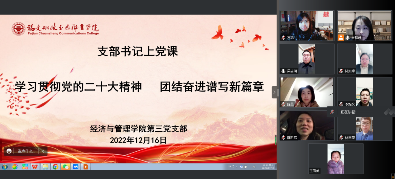 為增強(qiáng)學(xué)習(xí)宣傳貫徹黨的二十大精神的政治自覺、思想自覺、行動(dòng)自覺,切實(shí)推動(dòng)學(xué)習(xí)成果轉(zhuǎn)化為推進(jìn)學(xué)院各項(xiàng)工作高質(zhì)量發(fā)展的實(shí)際成效,2022年12月16日,經(jīng)濟(jì)與管理學(xué)院第三黨支部書記吳吉明以《學(xué)習(xí)貫徹黨的二十大精神,團(tuán)結(jié)奮進(jìn)譜寫新篇章》為題開展黨的二十大精神專題宣講,第三黨支部全體黨員參加了此次宣講。