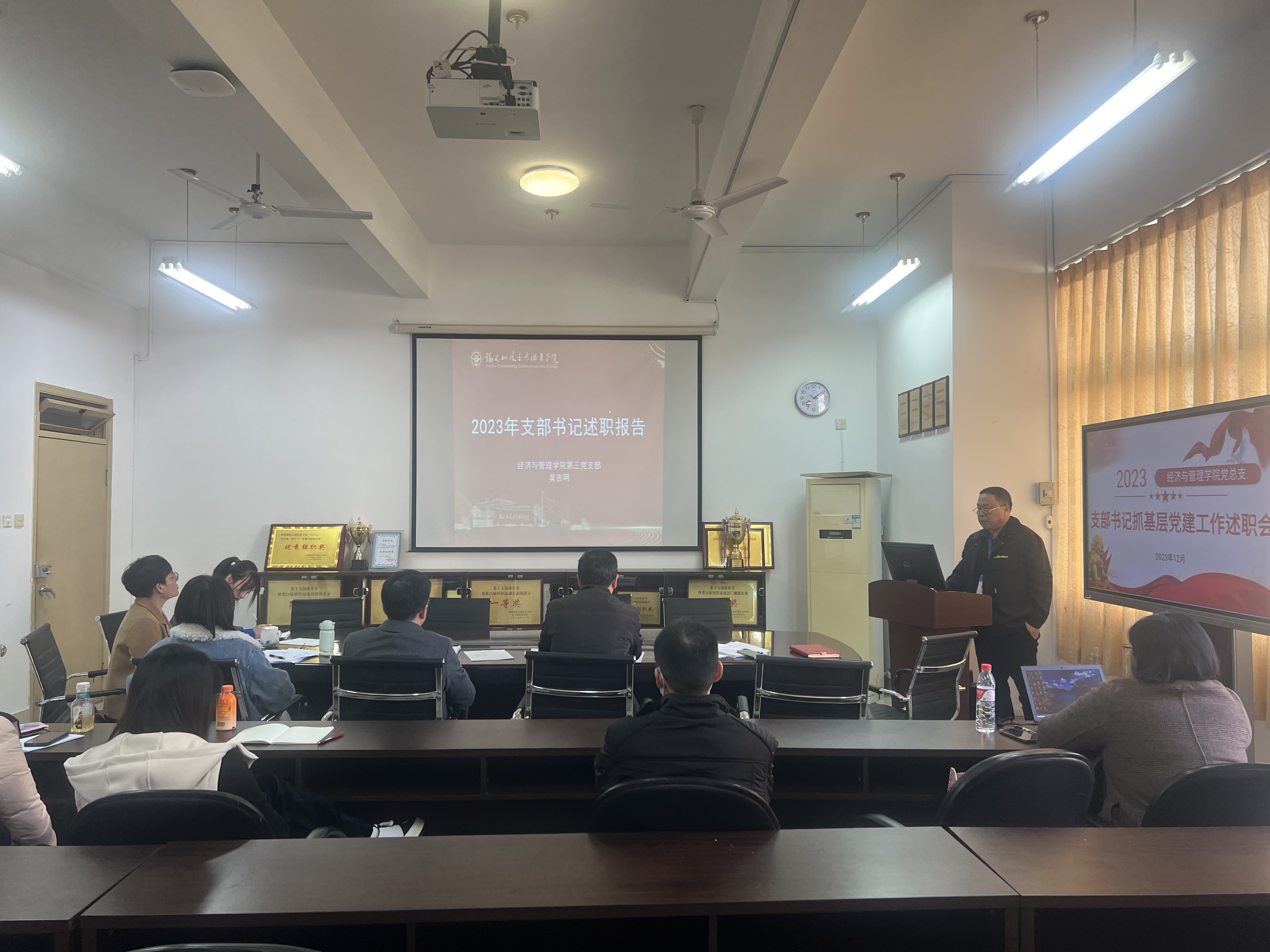 為進(jìn)一步提升基層黨組織書(shū)記履職能力,更好推動(dòng)學(xué)院各項(xiàng)工作高質(zhì)量發(fā)展,12月28日下午,經(jīng)濟(jì)與管理學(xué)院黨總支召開(kāi)2023年度基層黨組織書(shū)記抓基層黨建工作述職會(huì),以述明責(zé)、以評(píng)促干,用實(shí)干實(shí)績(jī)實(shí)效展現(xiàn)2023年“效果圖”、譜寫(xiě)2024年“新篇章”。學(xué)院副科級(jí)以上干部、各支部書(shū)記、副書(shū)記參加此次會(huì)議。