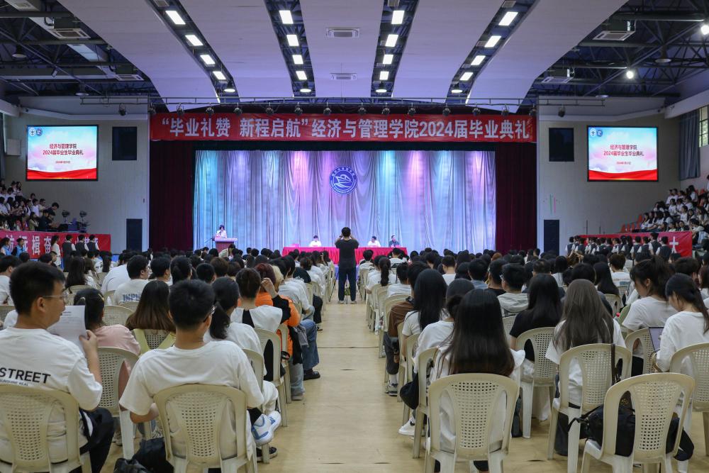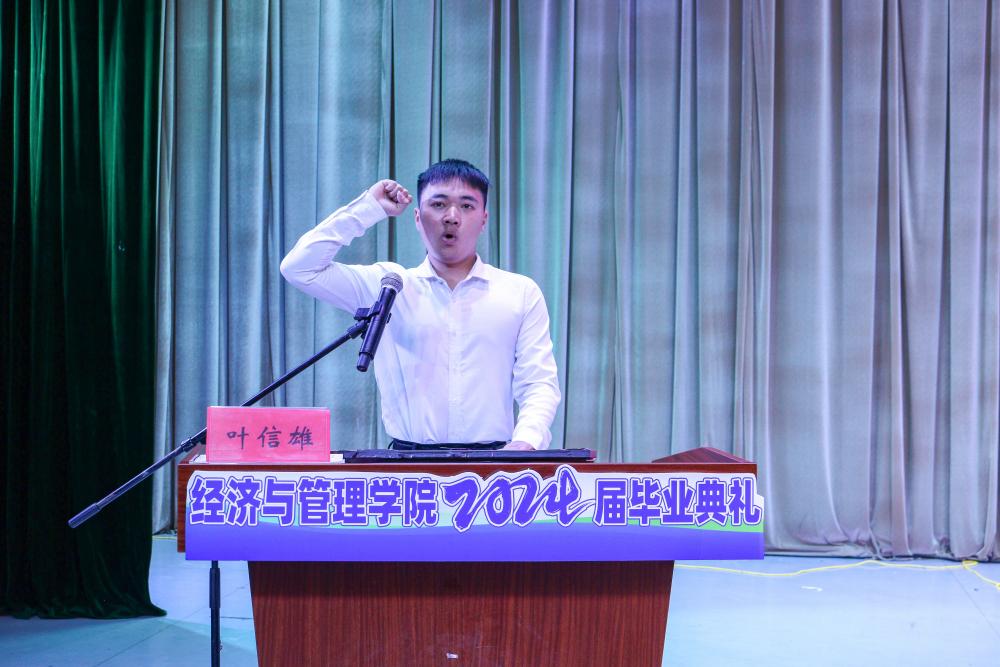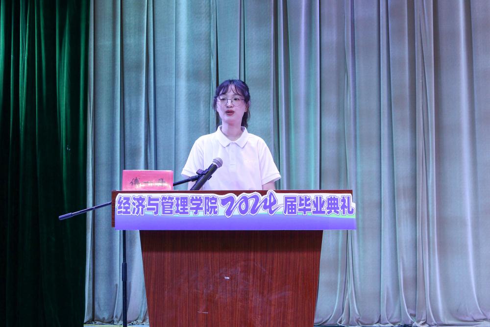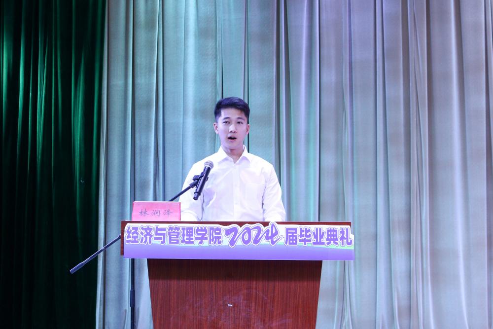 畢業(yè)生代表林潤澤感懷了在經(jīng)管學院三年的學習和生活經(jīng)歷,從相聚于此到如今奔赴五湖四海,他表達了同學間惺惺相惜的不舍,對老師們諄諄教誨的感激以及對學院的深深眷戀之情;同時,他分享了自身的學習經(jīng)歷以及對未來的展望,表示將在未來的道路上,不斷追求卓越,提升自我價值,并鼓勵同學們要積極面對未來的挑戰(zhàn),不斷提升自己的能力,堅定信念,勇往直前,用智慧和勇氣書寫新的時代篇章。