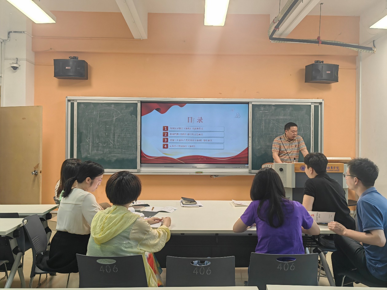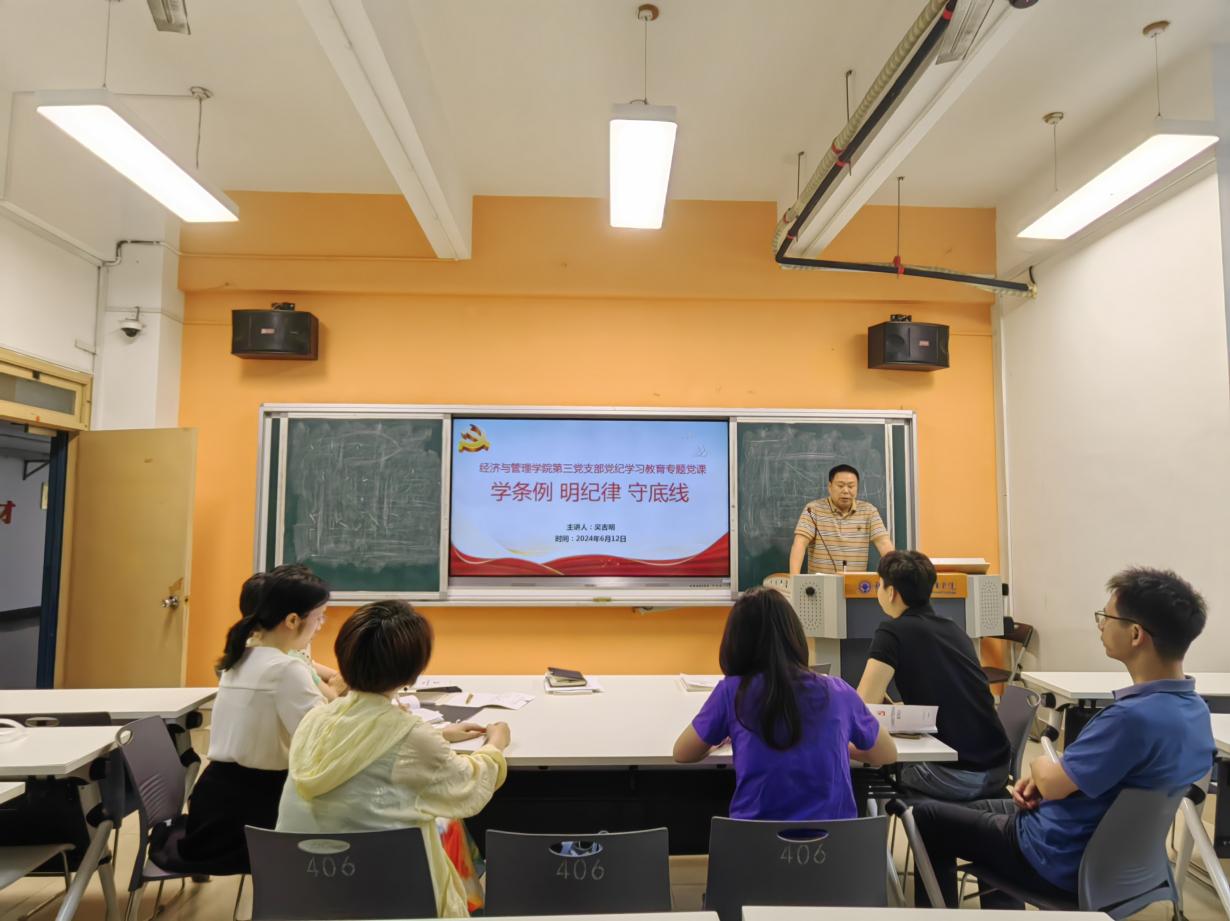為扎實開展黨紀學(xué)習(xí)教育,引導(dǎo)黨員教師們學(xué)紀、知紀、明紀、守紀,2024年6月12日,經(jīng)濟與管理學(xué)院第三黨支部書記吳吉明以“學(xué)條例 明紀律 守底線”為題為三支部全體黨員講授黨紀學(xué)習(xí)教育專題黨課。