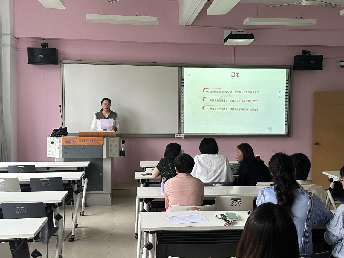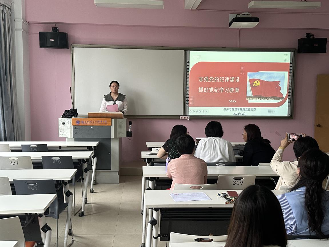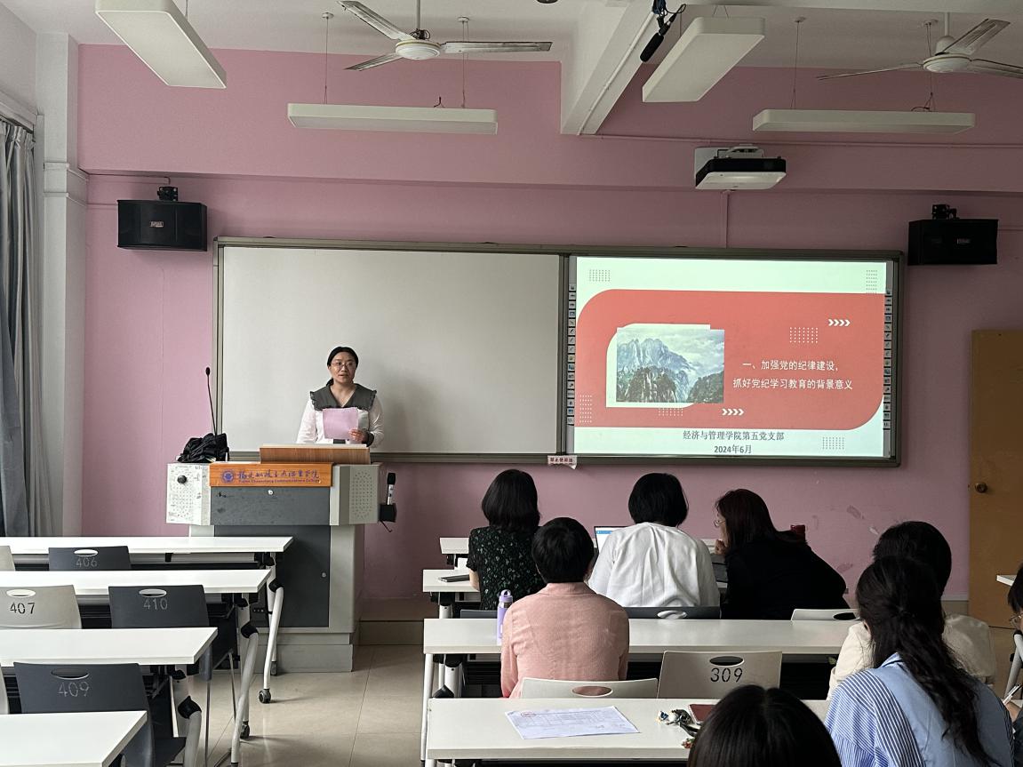 為深入開展黨紀(jì)學(xué)習(xí)教育,引導(dǎo)黨員教師學(xué)紀(jì)、知紀(jì)、明紀(jì)、守紀(jì),進一步推動黨紀(jì)學(xué)習(xí)教育走深走實,2024年6月5日,經(jīng)濟與管理學(xué)院第五黨支部舉辦“加強黨的紀(jì)律建設(shè)、抓好黨紀(jì)學(xué)習(xí)教育”專題黨課。本次黨課由支部書記林潔瑩授課,支部全體黨員參加了此次黨課。