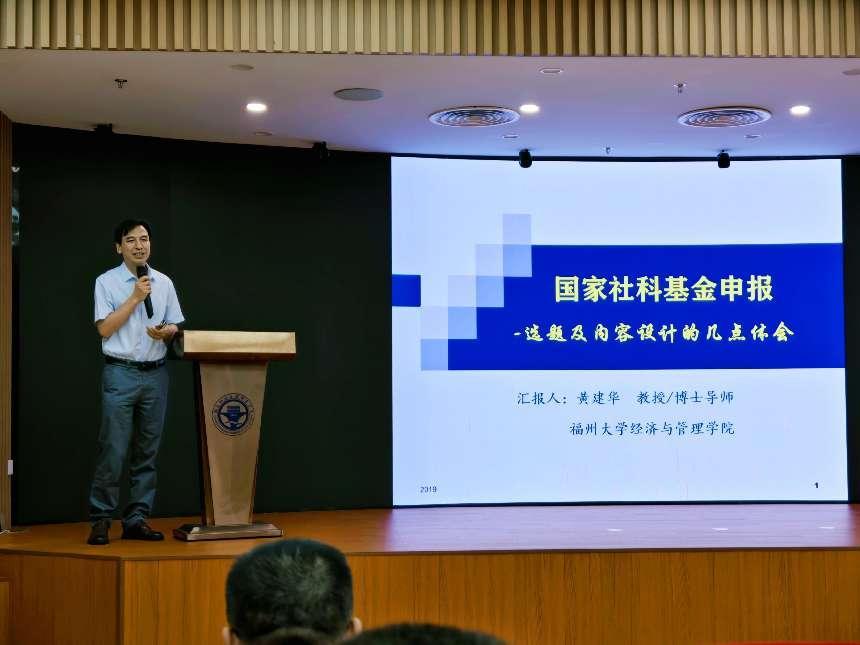 活動(dòng)邀請(qǐng)了福州大學(xué)經(jīng)濟(jì)與管理學(xué)院黃建華教授作主題講座。黃建華教授是福州大學(xué)物流研究院副院長(zhǎng)、福建省高層次人才、博士生導(dǎo)師。國(guó)家社科基金通訊評(píng)審專家,福建省、湖南省、河北省、江西省等省份的自然科學(xué)基金項(xiàng)目函評(píng)專家;兼任教育部學(xué)位中心博士論文、碩士論文評(píng)審專家,福建省政府投資項(xiàng)目評(píng)審專家、福州市發(fā)改委項(xiàng)目評(píng)審專家;福建省應(yīng)急廳應(yīng)急管理專家。講座以“國(guó)家社科基金申報(bào)”為題,為參會(huì)的博士教師們作了精彩報(bào)告。黃教授圍繞國(guó)家社科基金項(xiàng)目的指南走向、選題原則、論證活頁(yè)和申報(bào)書撰寫技術(shù)細(xì)節(jié)等視角展開(kāi)分享。他強(qiáng)調(diào)雖然國(guó)社科從課題指南發(fā)布到提交時(shí)間比較短,但中標(biāo)的課題一定是一個(gè)長(zhǎng)期思考與積累的結(jié)果。他鼓勵(lì)與會(huì)教師,將個(gè)人學(xué)術(shù)研究興趣與國(guó)家和社會(huì)發(fā)展相融合,積極申報(bào),反復(fù)打磨,爭(zhēng)取盡早取得突破。
