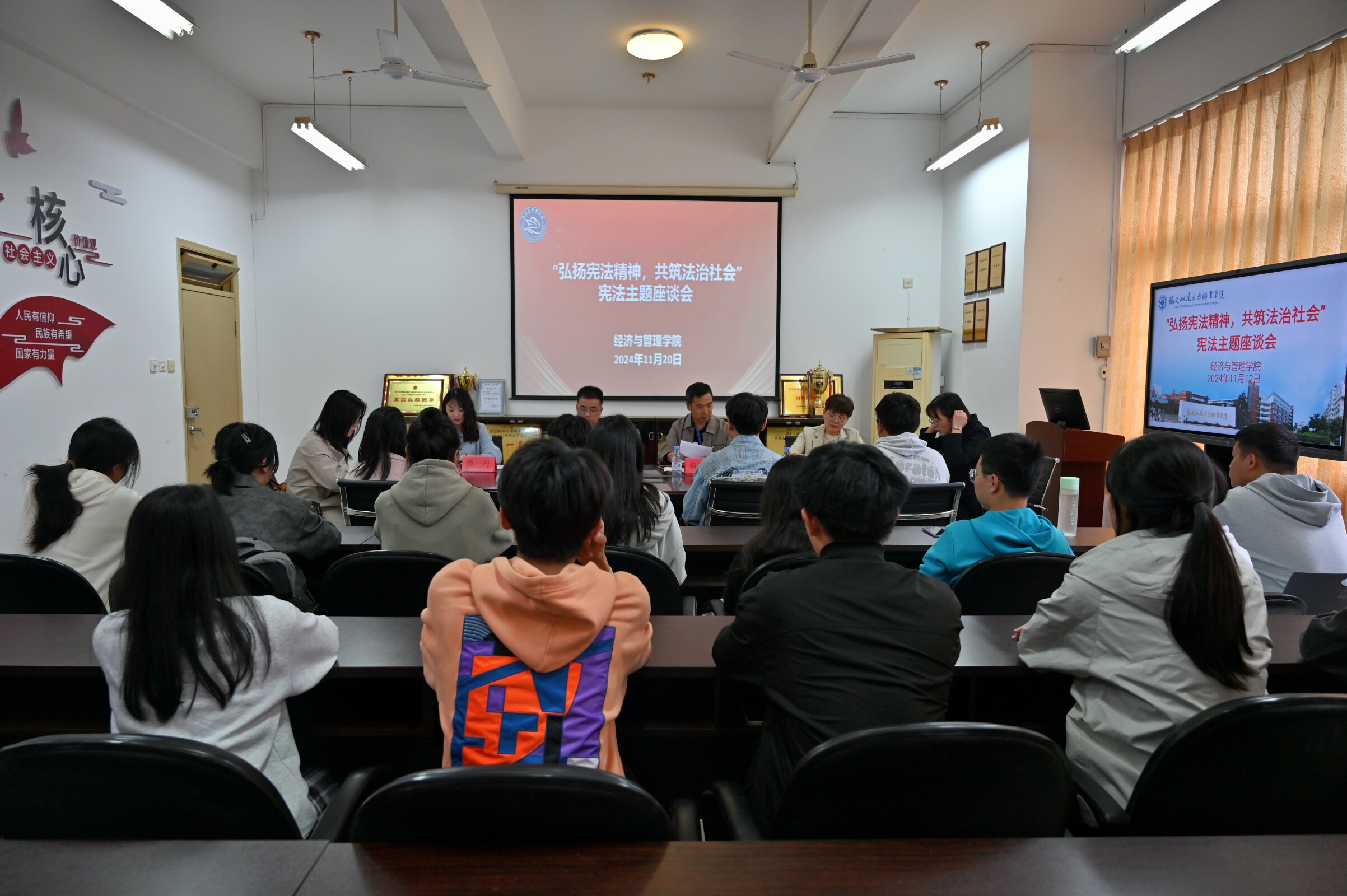 為深入貫徹習(xí)近平法治思想,經(jīng)濟(jì)與管理學(xué)院于2024年11月20日成功舉辦了“弘揚憲法精神,共筑法治社會”憲法主題座談會。黨總支書記俞素平、院長房曰榮、黨總支副書記林麗萍、團(tuán)委書記傅一丹及江瀟、王春英老師出席了本次活動。