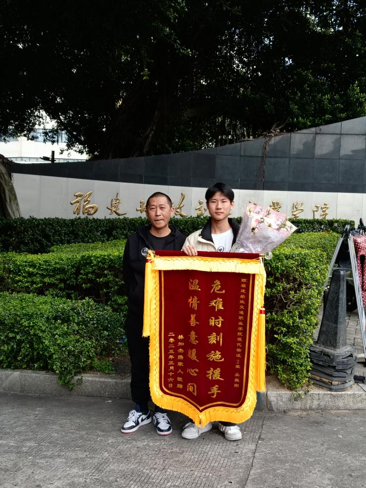 3月19日上午,受傷兒童的家長林先生專程來到學(xué)校,向吳振陽同學(xué)贈送了一面寫有“危難時刻施援手溫情善意暖心間”的錦旗,同時向?qū)W院教師團(tuán)隊致贈“育人楷模展風(fēng)范 愛心傳遞育賢才”錦旗,并與師生代表合影留念。林先生表示:“吳振陽同學(xué)的善舉讓我們感受到社會的溫暖,也體現(xiàn)了學(xué)院立德樹人的優(yōu)秀成果!”