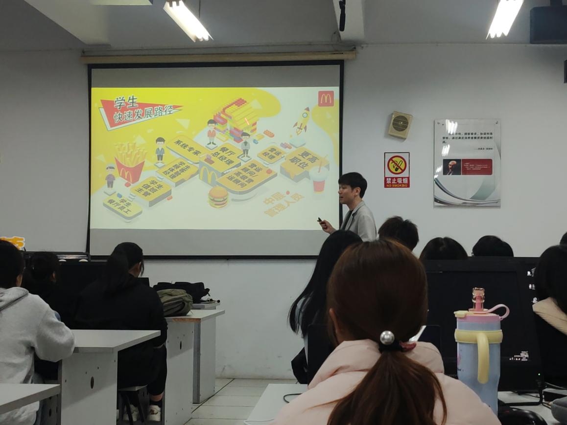 麥當(dāng)勞招聘專(zhuān)員孔焰老師結(jié)合麥當(dāng)勞人才培養(yǎng)體系,給同學(xué)上了一堂生動(dòng)的《餐飲行業(yè)認(rèn)知課》,解析零售行業(yè)對(duì)營(yíng)銷(xiāo)人才的能力要求,引導(dǎo)學(xué)生樹(shù)立 “細(xì)節(jié)決定品質(zhì)” 的職業(yè)意識(shí)。