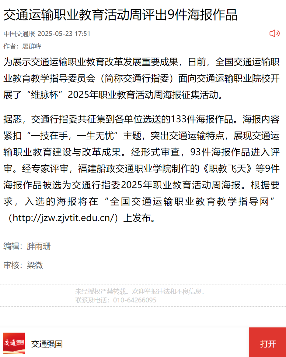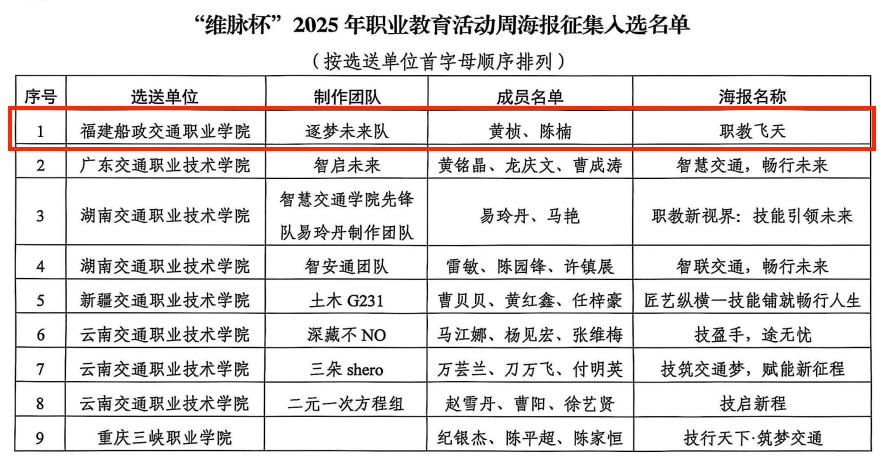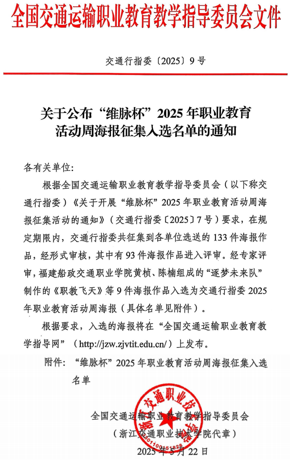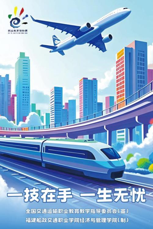 近期,全國交通運輸職業(yè)教育教學(xué)指導(dǎo)委員會(以下稱交通行指委)正式公布了2025年職業(yè)教育活動周海報征集結(jié)果,由經(jīng)濟(jì)與管理學(xué)院黃楨、陳楠兩名同學(xué)組成的“逐夢未來隊”(指導(dǎo)老師官源)提交的作品從全國133件投稿中脫穎而出,成功入選!此次活動僅有9件海報作品入選為交通行指委2025年職業(yè)教育活動周海報,入選的海報作品將在“全國交通運輸職業(yè)教育教學(xué)指導(dǎo)網(wǎng)”上發(fā)布。