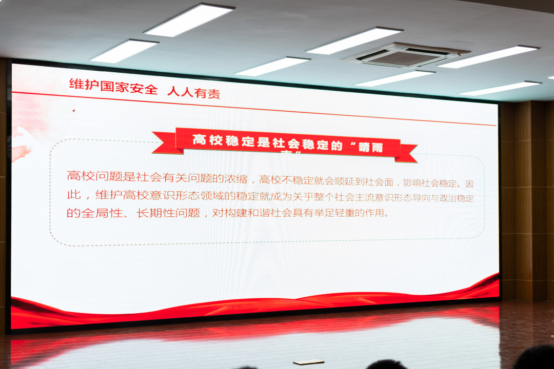 褚紅云副教授作為福建省公安廳國(guó)內(nèi)安全保衛(wèi)教育訓(xùn)練基地主任、福建省法學(xué)會(huì)國(guó)家安全法學(xué)研究會(huì)理事、公安部國(guó)內(nèi)安全保衛(wèi)局特聘教官,具有扎實(shí)的理論積淀和豐富的辦案經(jīng)驗(yàn)。她從維護(hù)國(guó)家安全人人有責(zé)這個(gè)大格局中,選取了高校安全和國(guó)家安全這個(gè)小視角進(jìn)行剖析解讀。“高校穩(wěn)定是社會(huì)穩(wěn)定的晴雨表”,褚教授通過(guò)發(fā)生在校園中,發(fā)生在高校學(xué)者、青年學(xué)生身上的境外滲透、宗教活動(dòng)、互聯(lián)網(wǎng)犯罪等真實(shí)案例,具象生動(dòng)的闡釋了高校中存在的國(guó)家安全風(fēng)險(xiǎn)、兩者之間的關(guān)系及高校的應(yīng)對(duì)建議。引導(dǎo)船政學(xué)子將愛(ài)國(guó)熱情轉(zhuǎn)換為愛(ài)國(guó)智慧,將報(bào)國(guó)情懷踐行為報(bào)國(guó)行動(dòng),為守衛(wèi)國(guó)家的長(zhǎng)治久安,維護(hù)校園的安定穩(wěn)定貢獻(xiàn)青年學(xué)子的智慧和力量。