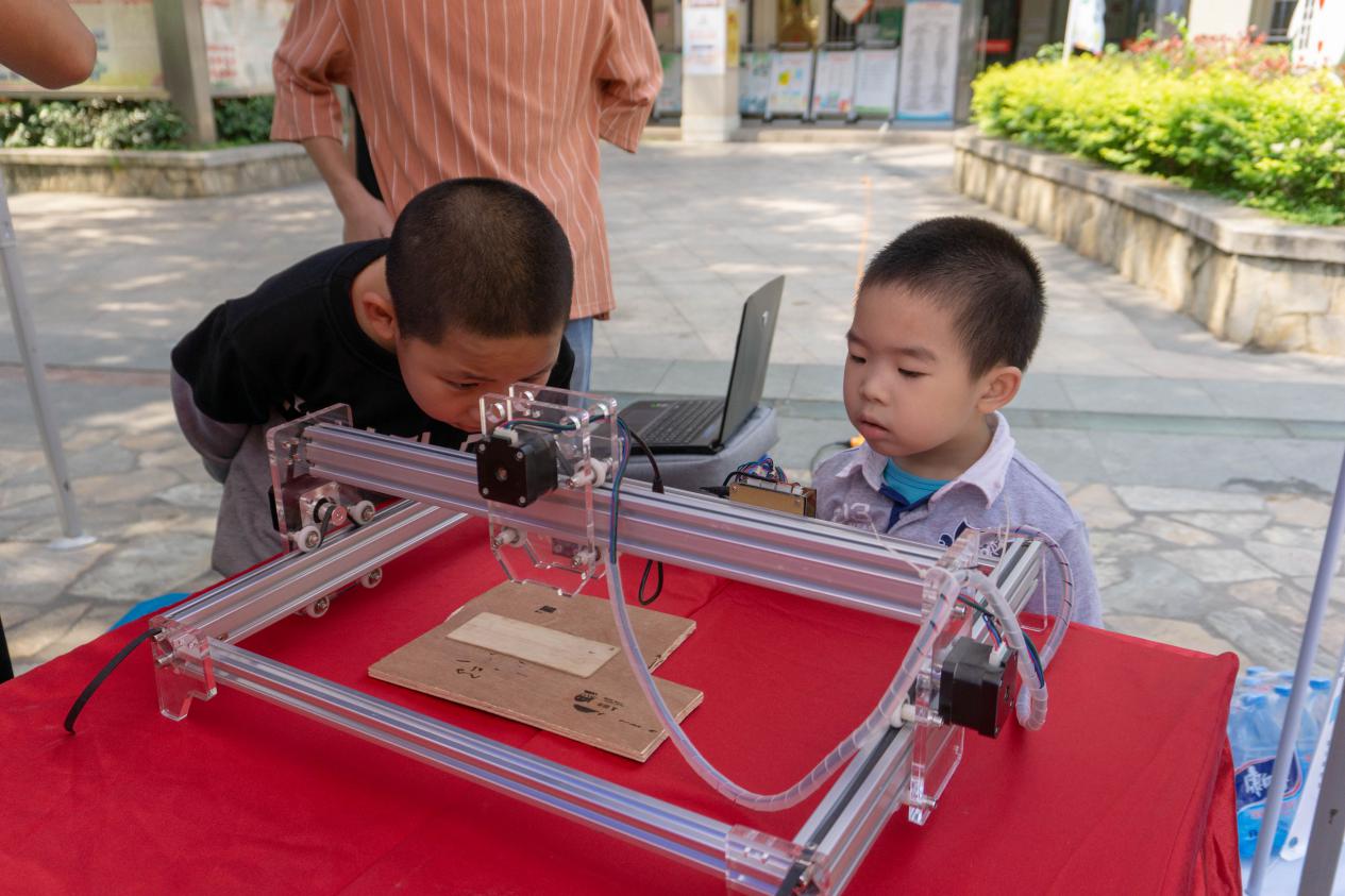 在蘭亭新天地社區(qū)廣場(chǎng)活動(dòng)現(xiàn)場(chǎng),機(jī)械系機(jī)器人協(xié)會(huì)的同學(xué)們向群眾展示了“機(jī)器人對(duì)抗小車”和“激光打印雕刻機(jī)”。同學(xué)們向現(xiàn)場(chǎng)的群眾和小朋友們現(xiàn)場(chǎng)演示、生動(dòng)講解了“機(jī)器人對(duì)抗小車”和“激光打印雕刻機(jī)”的基本原理和操作方法;并與觀眾互動(dòng),回答他們提出的問(wèn)題,耐心詳細(xì)解答了為何機(jī)器人小車能夠在桌面行駛而不掉落、激光雕刻機(jī)如何識(shí)別圖像等問(wèn)題。在社區(qū)活動(dòng)現(xiàn)場(chǎng),觀眾群體主要以中小學(xué)生和老年人為主,對(duì)于中小學(xué)生來(lái)說(shuō),有著強(qiáng)烈的求知欲,酷炫的科技展示和生動(dòng)的知識(shí)普及講解能夠很快吸引他們的注意力。而老年人則主要表達(dá)出對(duì)現(xiàn)今社會(huì)的新興科技強(qiáng)烈的興趣,感嘆于社會(huì)的進(jìn)步和科技的發(fā)展,并表示對(duì)于此次的職業(yè)教育進(jìn)社區(qū)活動(dòng)十分的滿意。