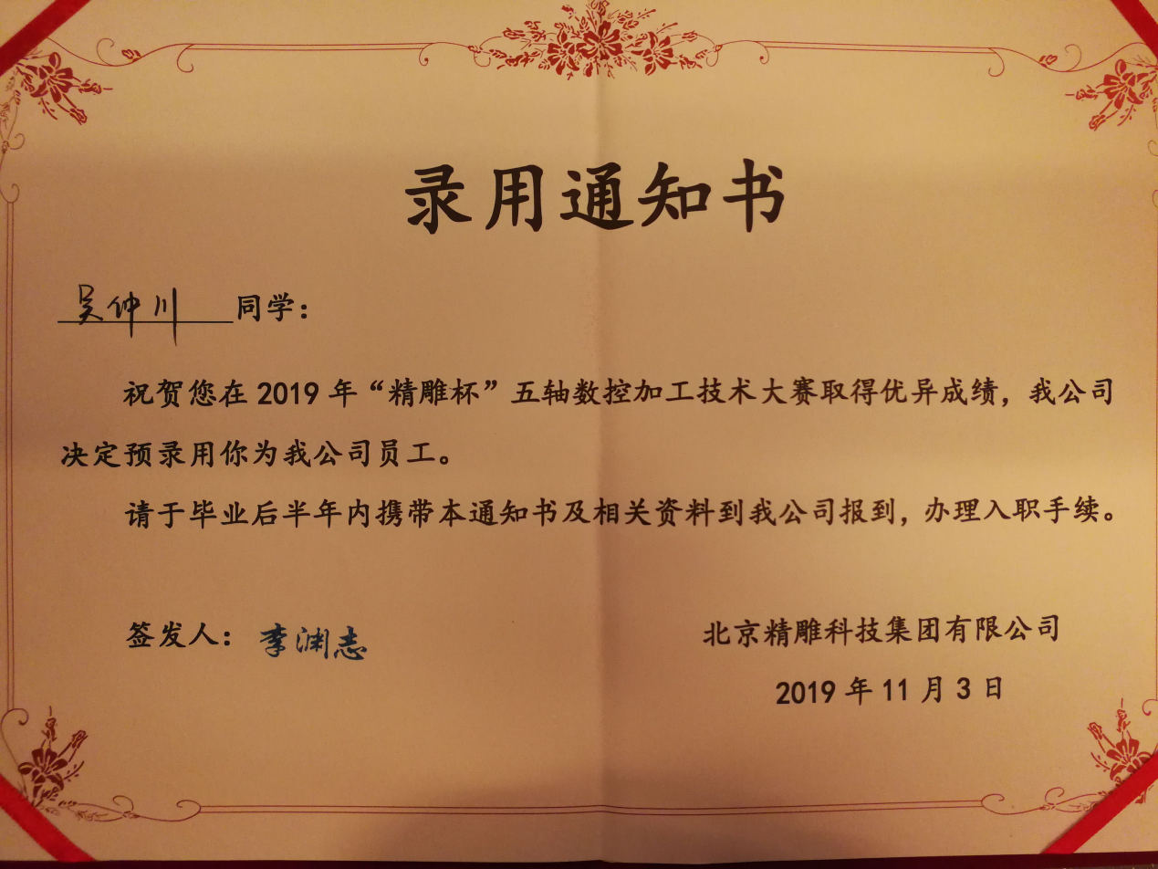 2019年度全國(guó)機(jī)械行業(yè)職業(yè)教育技能大賽——“精雕杯”五軸數(shù)控加工技術(shù)的比賽于10月31日至11月2日在廣東東莞舉行,我院學(xué)生吳仲川、魏再煌組成的代表隊(duì)榮獲全國(guó)第二名暨一等獎(jiǎng),指導(dǎo)教師李云妹、謝祖華被評(píng)為“優(yōu)秀指導(dǎo)教師”,吳仲川、魏再煌兩位同學(xué)憑借嫻熟的技能和優(yōu)異的表現(xiàn)直接被北京精雕科技集團(tuán)有限公司錄用,畢業(yè)后可直接前往北京辦理入職手續(xù)。