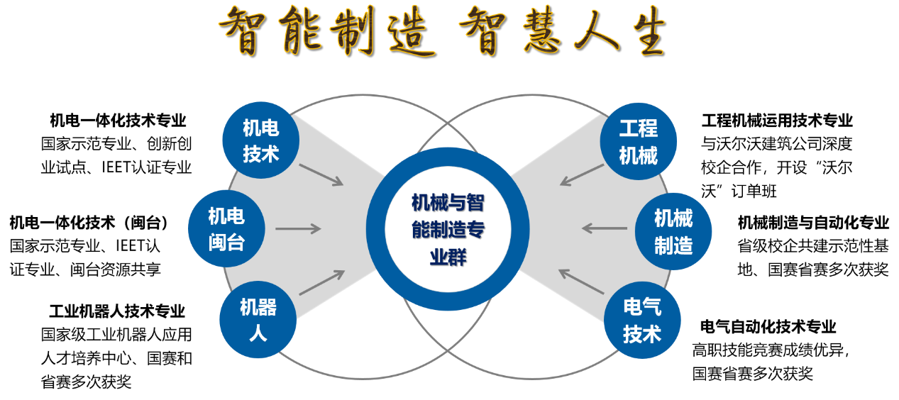 機(jī)械與智能制造專業(yè)群主要由機(jī)電一體化技術(shù)、工業(yè)機(jī)器人技術(shù)、電氣自動化技術(shù)、機(jī)械制造與自動化技術(shù)和工程機(jī)械運(yùn)用技術(shù)等5個專業(yè)組成。面向先進(jìn)制造業(yè)的數(shù)字化設(shè)計、智能化生產(chǎn)、智慧化服務(wù)、工程機(jī)械運(yùn)用等領(lǐng)域用人單位,以立德樹人為根本,突出工業(yè)產(chǎn)品生命全周期管理意識;培養(yǎng)具備數(shù)字化設(shè)計,智能制造,生產(chǎn)質(zhì)量品控,機(jī)電設(shè)備安裝,智能控制,成套機(jī)電設(shè)備調(diào)試,智慧電氣監(jiān)控、工程機(jī)械運(yùn)用與維修等復(fù)合能力,具有可持續(xù)發(fā)展能力的智能產(chǎn)線工藝設(shè)計員、機(jī)電控制系統(tǒng)設(shè)計員、產(chǎn)品三維創(chuàng)新設(shè)計員、機(jī)械制造工藝設(shè)計員、工業(yè)機(jī)器人控制技術(shù)員、機(jī)電設(shè)備運(yùn)行技術(shù)員 、智能產(chǎn)線操作技術(shù)員 、自動加工島操作技術(shù)員 、精密測量與檢測技術(shù)員、自動化系統(tǒng)維護(hù)技術(shù)員、工業(yè)機(jī)器人維護(hù)技術(shù)員、智慧電氣系統(tǒng)維護(hù)技術(shù)員、機(jī)電設(shè)備營銷服務(wù)專員、云平臺管理人員、工程機(jī)械維修維護(hù)和操作人員等高端技術(shù)技能人才,為制造強(qiáng)國和區(qū)域經(jīng)濟(jì)社會發(fā)展提供優(yōu)質(zhì)人才資源支撐。