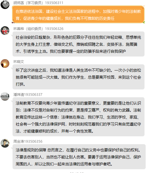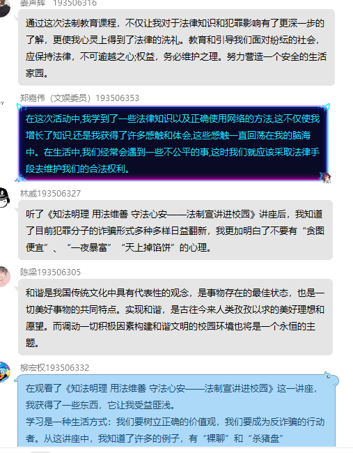 在這里不禁有同學(xué)會問:此次法治宣講用處有多大呢?在高速發(fā)展的信息時(shí)代,騙子的手段也在與時(shí)俱進(jìn),劉警官的此次宣講貼近我們現(xiàn)在的生活,是我們可能會遇到的情況,讓我們對社會上形形色色的案件更加的了解。這些看似簡簡單單的話語,蘊(yùn)含的都是實(shí)實(shí)在在的法律知識,當(dāng)遇到我們無法處理的事情時(shí),最重要的就是要保護(hù)好自己,及時(shí)尋求法律的幫助。
