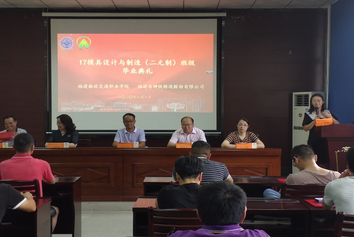 8月8日下午,福建船政交通職業(yè)學(xué)院機(jī)械與智能制造學(xué)院2020屆“二元制”班級(jí)畢業(yè)典禮在福建省神悅鑄造股份有限公司隆重舉行。福建省神悅鑄造股份有限公司占菊鳳董事長,劉成章總經(jīng)理,周春梅部長,機(jī)械與智能制造學(xué)院陳貴清副院長,陳忠士教授,藍(lán)敏俐副教授,莊智群老師以及“二元制”班級(jí)的所有同學(xué)共同出席典禮。長泰縣科技局李少陵局長為畢業(yè)典禮發(fā)來賀詞。