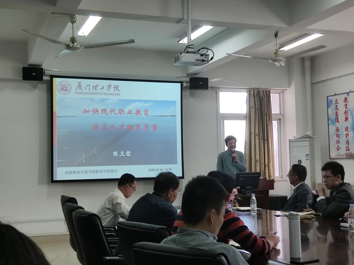今年全國職業(yè)教育宣傳周活動的主題是“技能人才展時代風采,職教奮進慶祖國華誕”。為積極響應(yīng)全國職業(yè)教育宣傳周的號召,營造濃厚的職業(yè)宣傳氛圍,提高社會各界對職業(yè)教育的認可度,進一步深化職業(yè)教育教學(xué)改革,推進現(xiàn)代職業(yè)教育,提高教學(xué)質(zhì)量,切實加強技能型人才的培養(yǎng),11月3日下午,我院邀請原廈門理工學(xué)院校長陳文哲教授作《加快現(xiàn)代職業(yè)教育 提高人才培養(yǎng)質(zhì)量》專題講座。機械學(xué)院全體教職工參會聽講,報告會由機械學(xué)院院長楊開懷博士主持。