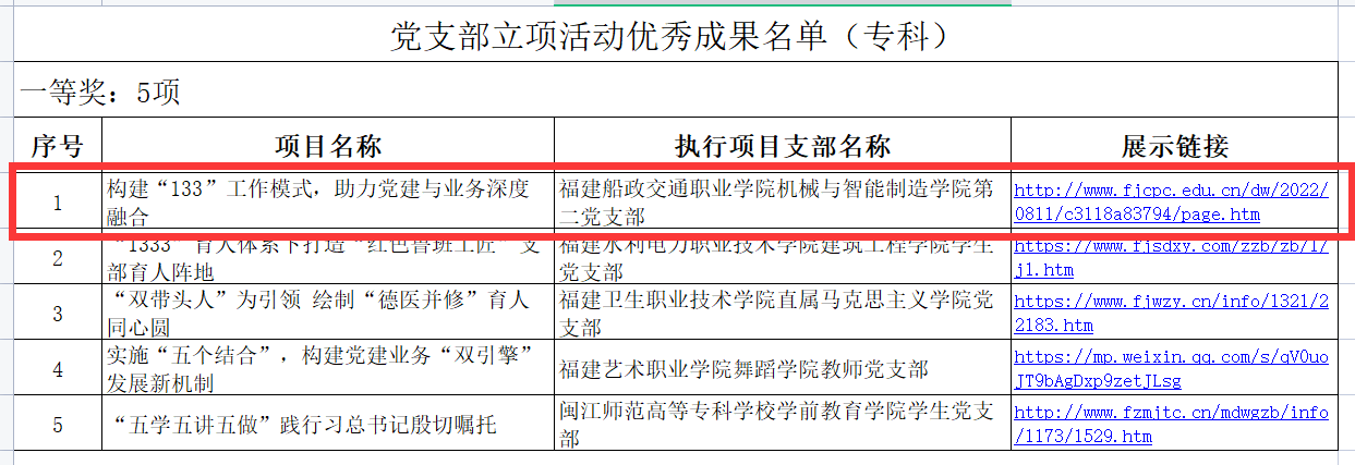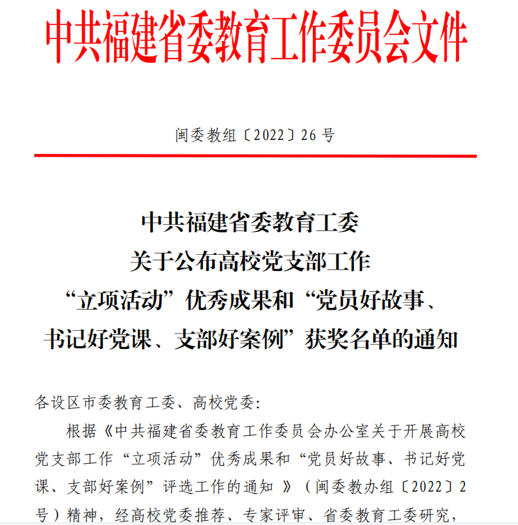 近日,中共福建省委教育工委發(fā)布了《關(guān)于公布高校黨支部工作“立項(xiàng)活動(dòng)”優(yōu)秀成果和“黨員好故事、書記好黨課、支部好案例”獲獎(jiǎng)名單的通知》(閩委教組〔2022〕49號(hào))。我院第二黨支部申報(bào)的《構(gòu)建“133”工作模式,助力黨建與業(yè)務(wù)深度融合》獲得高職高專院校黨支部工作“立項(xiàng)活動(dòng)”優(yōu)秀成果一等獎(jiǎng)。