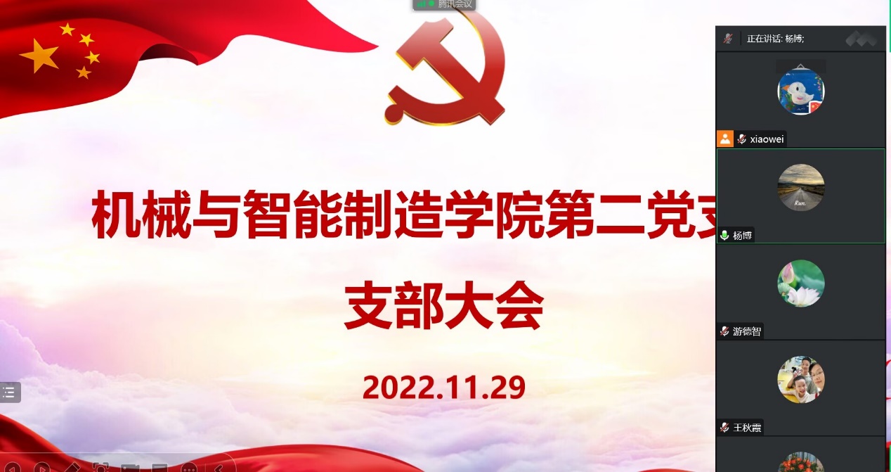 2022年11月29日,機(jī)械與智能制造學(xué)院第二黨支部在線上召開支部學(xué)習(xí)大會(huì),學(xué)習(xí)《習(xí)近平:在二十屆中央政治局常委同中外記者見面時(shí)的講話》、《中國共產(chǎn)黨章程》(中國共產(chǎn)黨第二十次全國代表大會(huì)部分修改,2022年10月22日通過)、《孫春蘭:辦好人民滿意的教育》、《省委常委會(huì)召開會(huì)議認(rèn)真學(xué)習(xí)貫徹習(xí)近平總書記重要講話重要指示精神 周祖翼主持并研究貫徹落實(shí)措施》等文件精神。